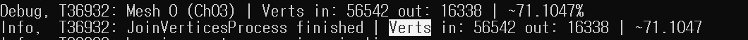 그런데 재밌는 점을 발견했다. assimp의 scene을 읽을때 aiProcess_JoinIdenticalVertices 플래그를 켜줘야 JoinVerticesProcess가 발동된다는것이다. 한번 켜보고 로그를 띄워봤다.